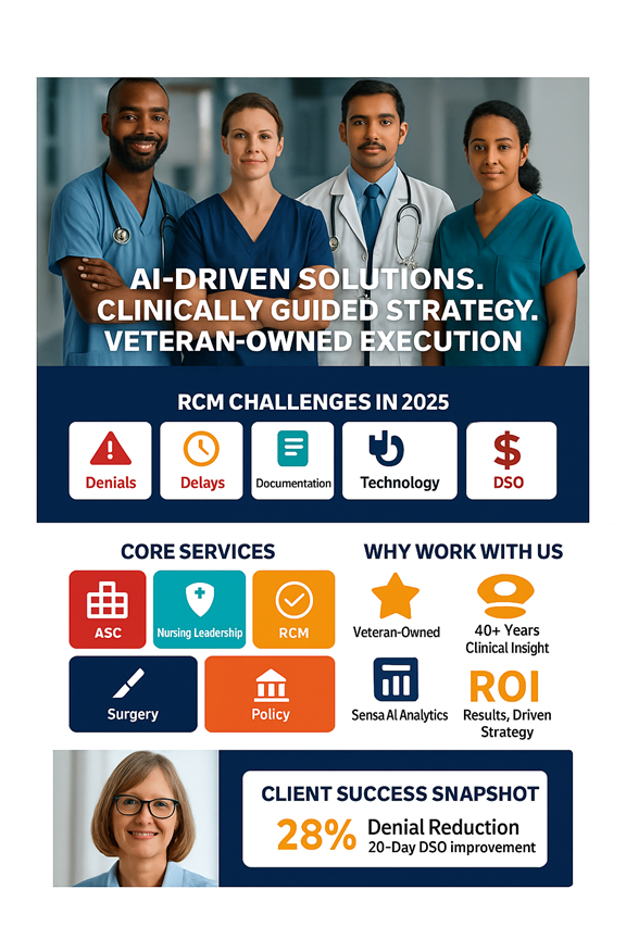In today’s healthcare environment, providers are battling rising administrative burdens, inconsistent payer rules, and shrinking profit margins. Elevate Vets Consulting (EVC)—in partnership with The Preo Group (TPG) and SensaServices.ai (Sensa)—delivers a proven solution that blends cutting-edge AI technology, clinical expertise, and strategic revenue cycle management (RCM) insight to maximize your financial performance.